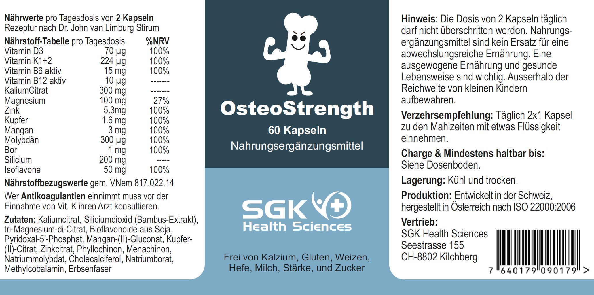 Vitamin K1 und K2: Sind Cofaktoren für die Synthese von Osteocalcin, ein Haupt-Protein von Osteoblasten, welche den Knochenmatrix aufbauen. Osteocalcin ist an den ersten Schritten der Knochen-Mineralisierung beteiligt. Zudem verhindert Vitamin K Gefässverkalkung durch überschüssiges Calcium und können Kalkablagerungen sogar wieder abbauen.